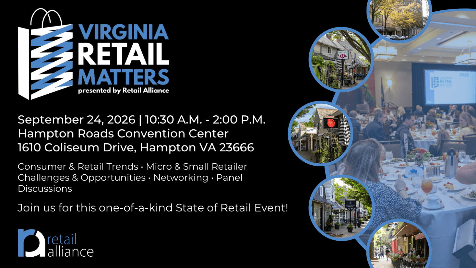 This luncheon will include a presentation of an in-depth retail study commissioned by Retail Alliance and conducted by Main Street America. The study analyzed current sales statistics and retail trends, blending them with national and state findings from their Small Business Survey of micro and small brick-and-mortar retailers across the U.S, to provide an in-depth look at the State of Retail in the U.S. and, in particular, Virginia. Every attendee receives a printed copy of our award-winning report.